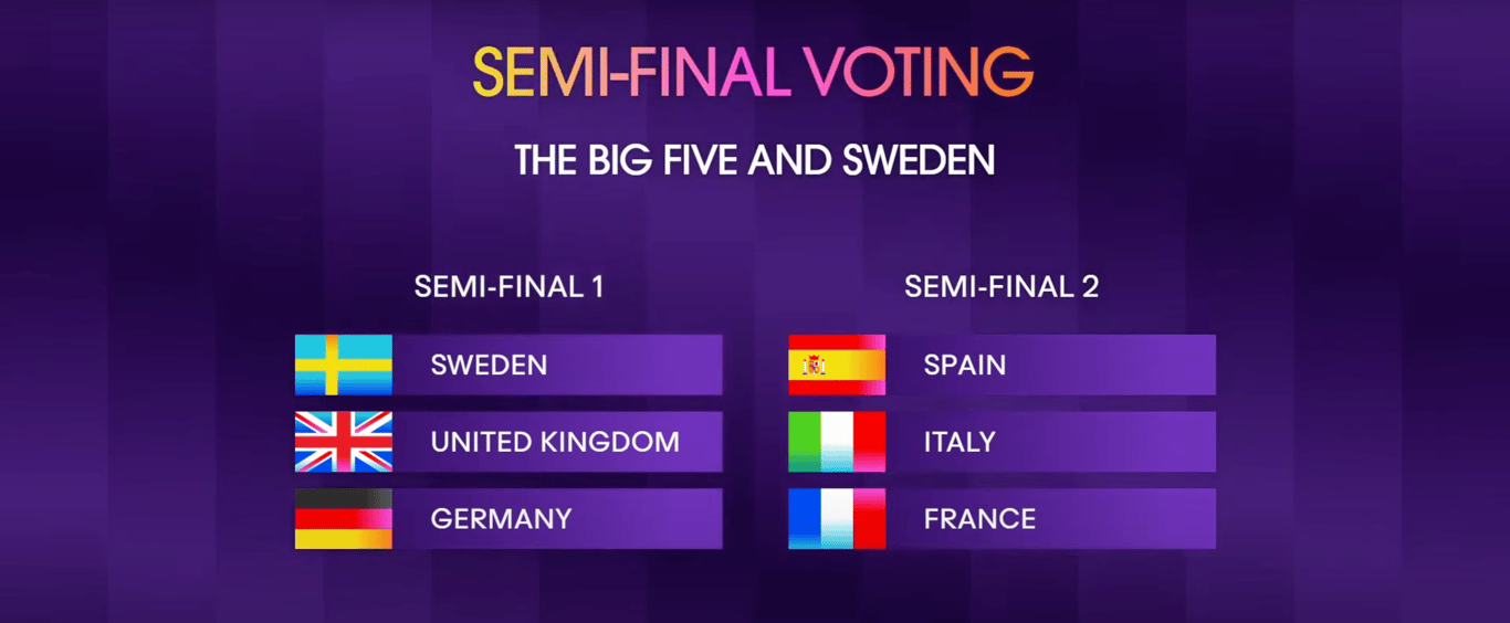 Представители стран "Великой пятерки" (Великобритании, Франции, Германии, Италии и Испании) и хозяйка конкурса Швеция впервые исполнят свои песни вживую во время полуфиналов конкурса. В предыдущие годы в это время показывали лишь краткие отрывки из генеральных репетиций.